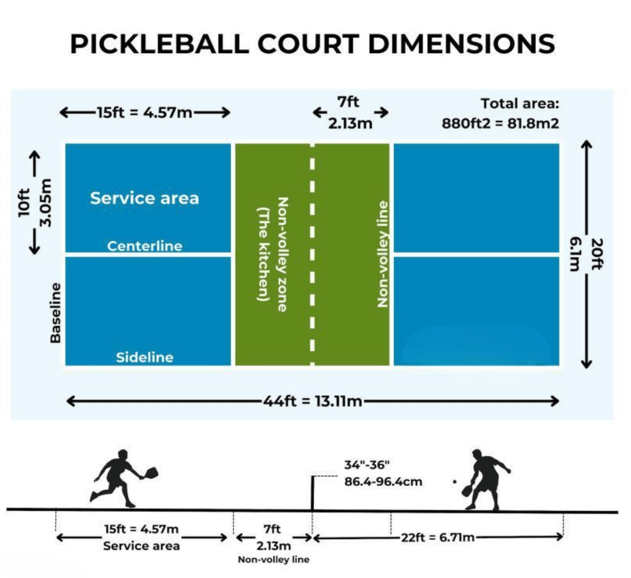 Gần bằng sân cầu lông nhưng lưới thấp hơn.